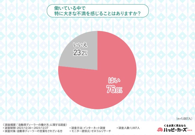 「働いている中で特に大きな不満を感じることはありますか?」と質問したところ、約8割の方が『はい(76.8%)』と回答しました。