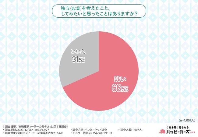 「独立(起業)を考えたこと、してみたいと思ったことはありますか?」と質問したところ、約7割が『はい(68.5%)』と回答しました。
