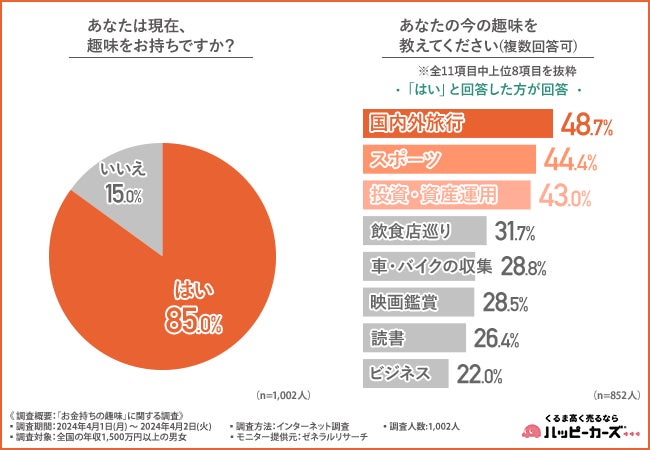 株式会社ハッピーカーズ(本社所在地:神奈川県鎌倉市、代表取締役:新佛 千治)は、全国の年収1,500万円以上の男女を対象に、「お金持ちの趣味」に関する調査を実施しました。