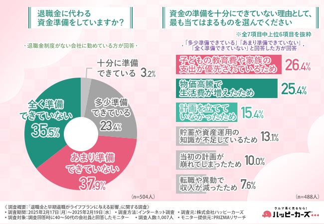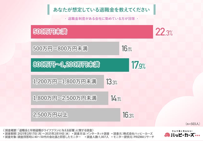 株式会社ハッピーカーズ(本社所在地:神奈川県鎌倉市、代表取締役:新佛 千治)は、40~50代の会社員を対象に、「退職金と早期退職がライフプランに与える影響」に関する調査を実施しました。
