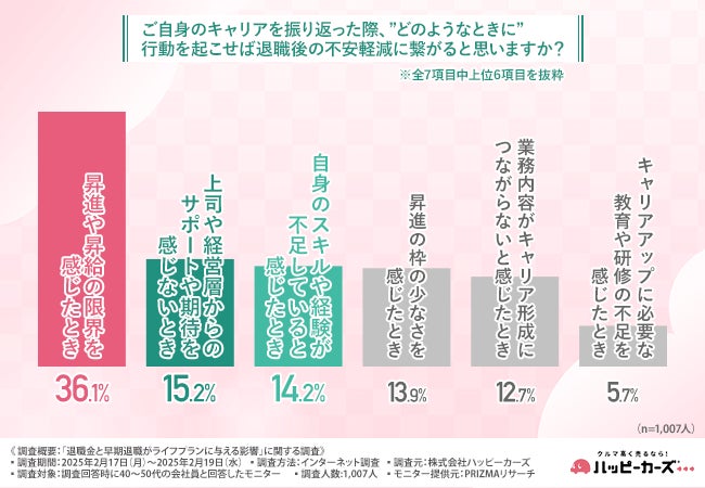 再び全員に、「ご自身のキャリアを振り返った際、“どのようなときに”行動を起こせば退職後の不安軽減に繋がると思いますか?」と質問したところ、『昇進や昇給の限界を感じたとき(36.1%)』と回答した方が最も多く、次いで『上司や経営層からのサポートや期待を感じないとき(15.2%)』『自身のスキルや経験が不足していると感じたとき(14.2%)』となりました。